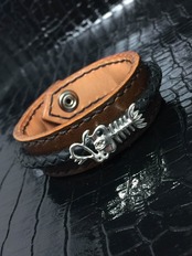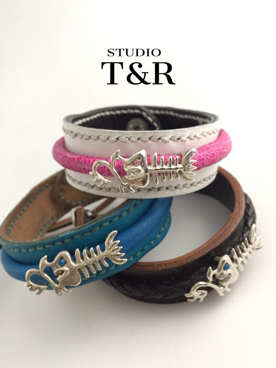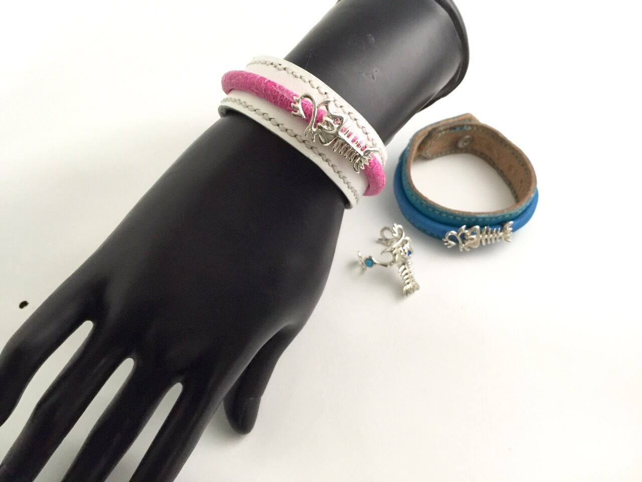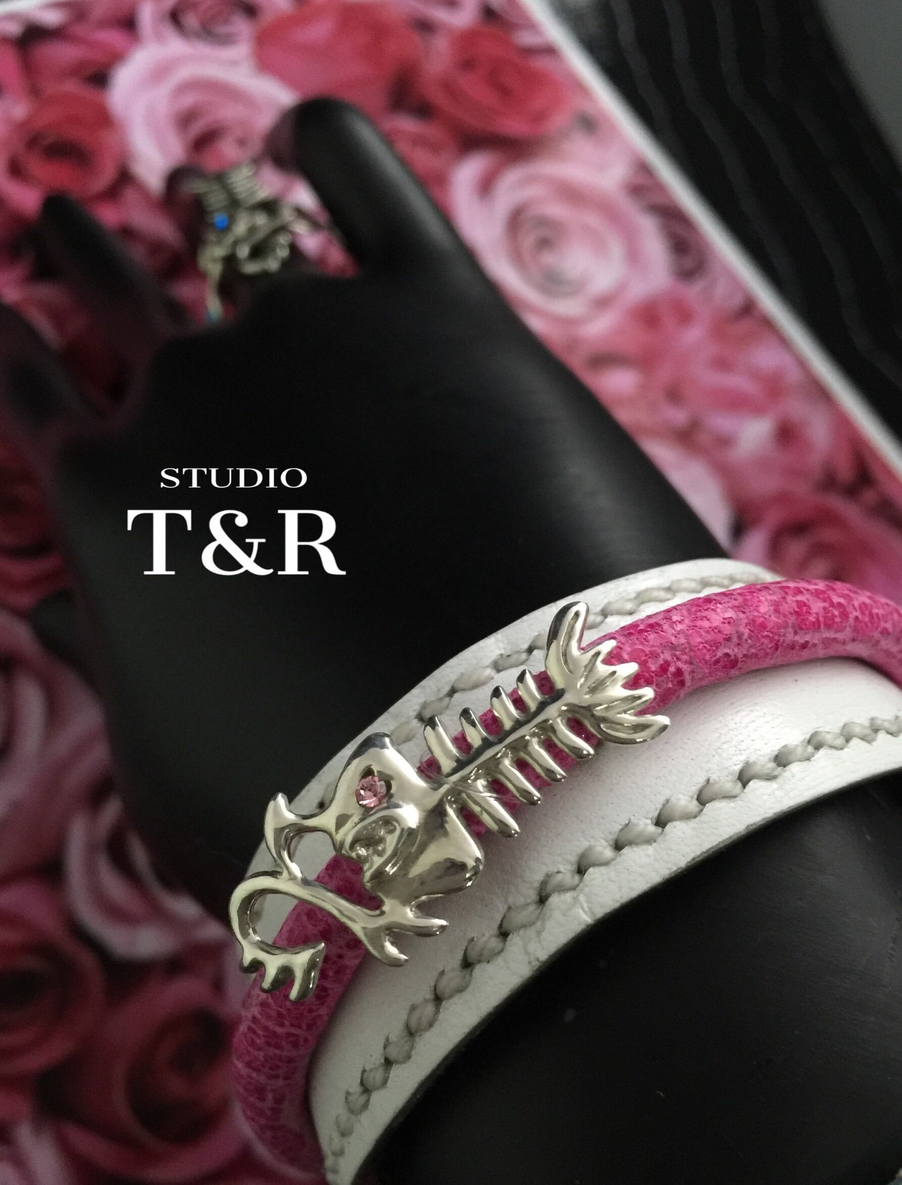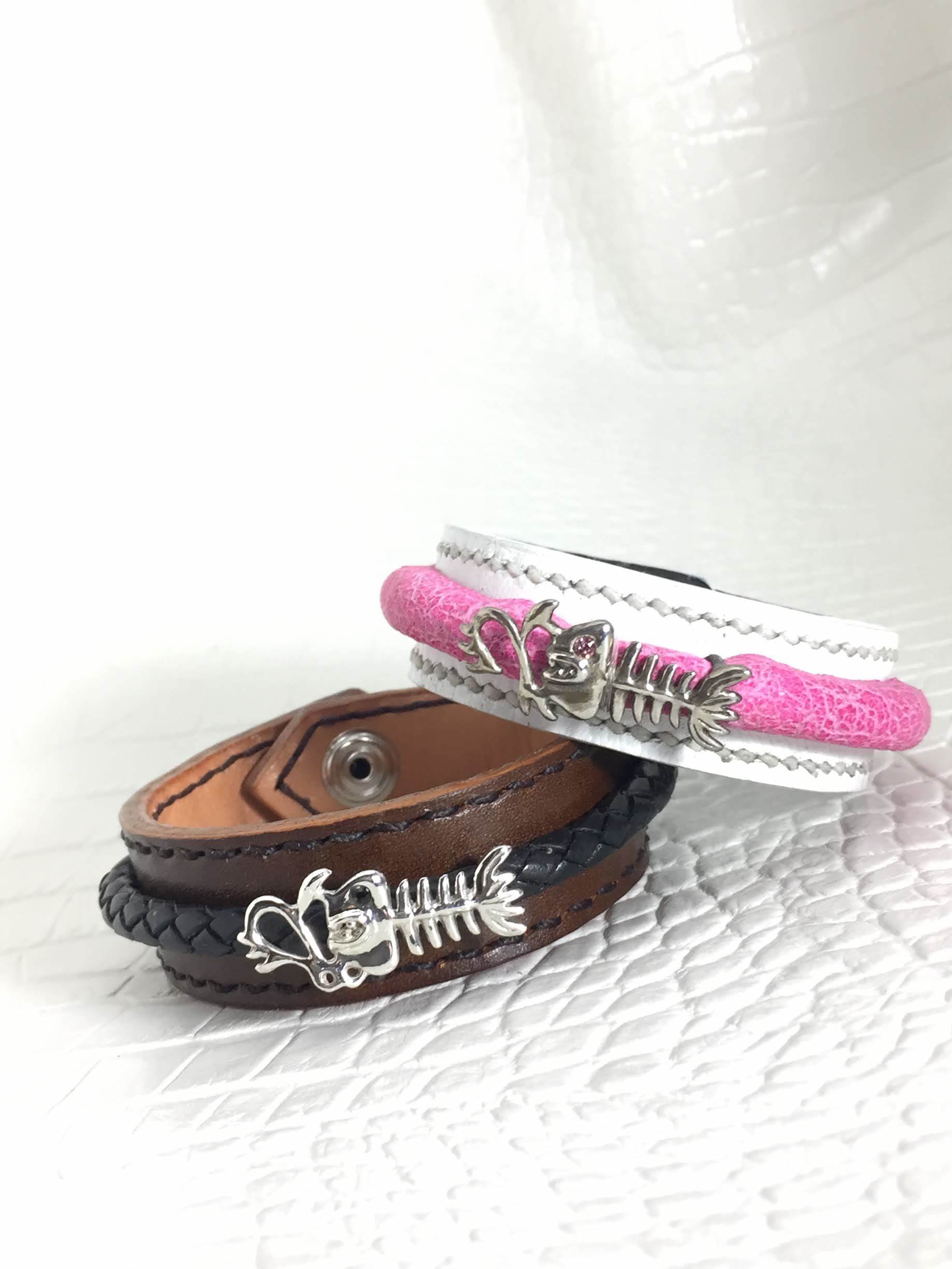 白とピンクのコンビネーションの革がオシャレで可愛いらしいブレスレットてす。