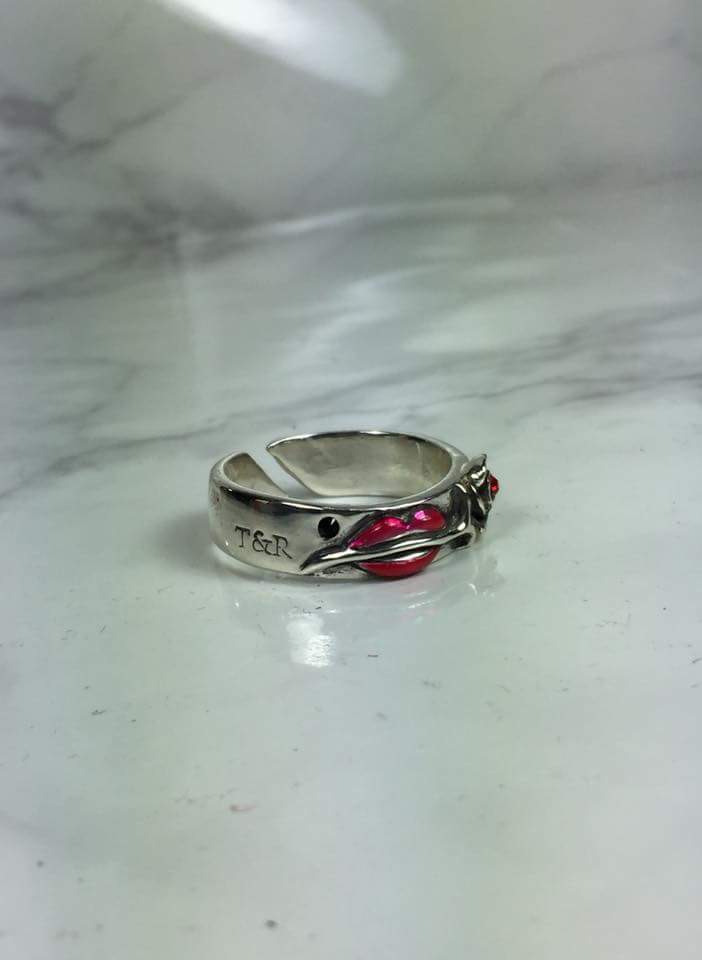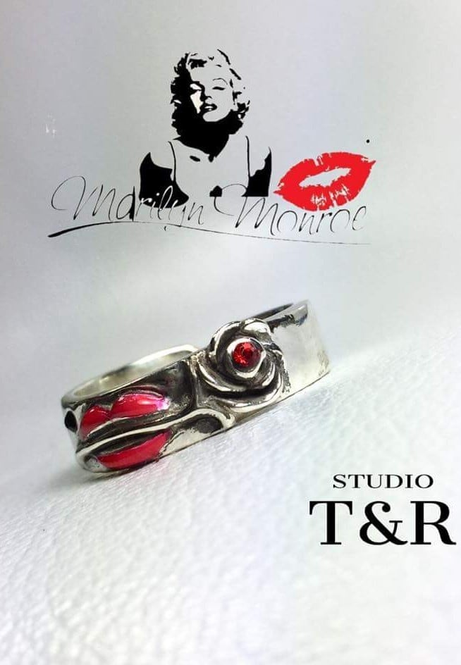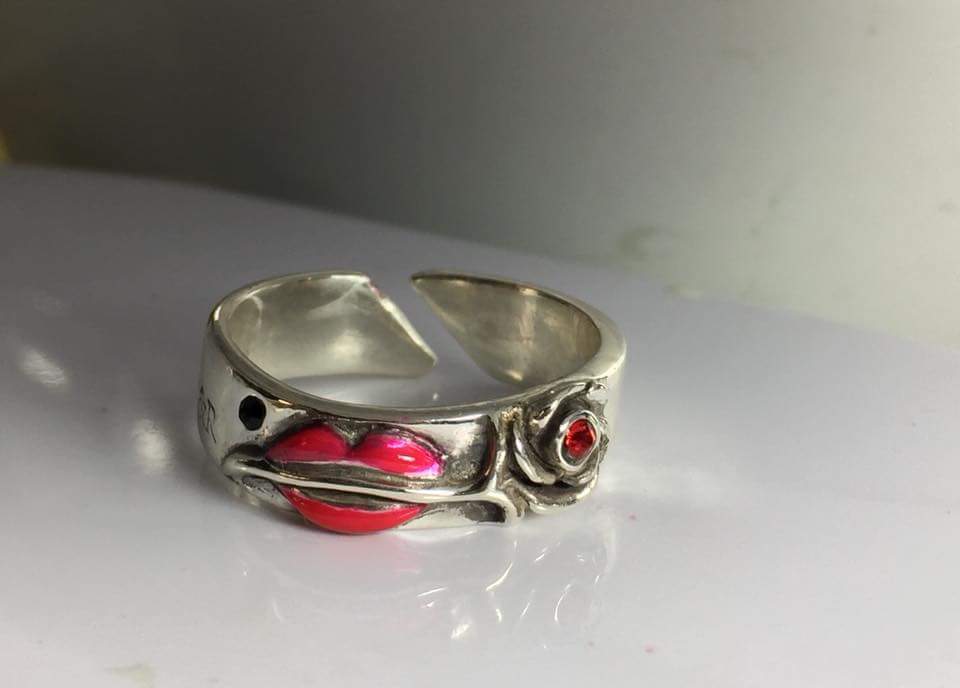 唇の左横にはホクロをイメージして黒のスワロフスキーを、薔薇には赤のスワロをはめ込みました。