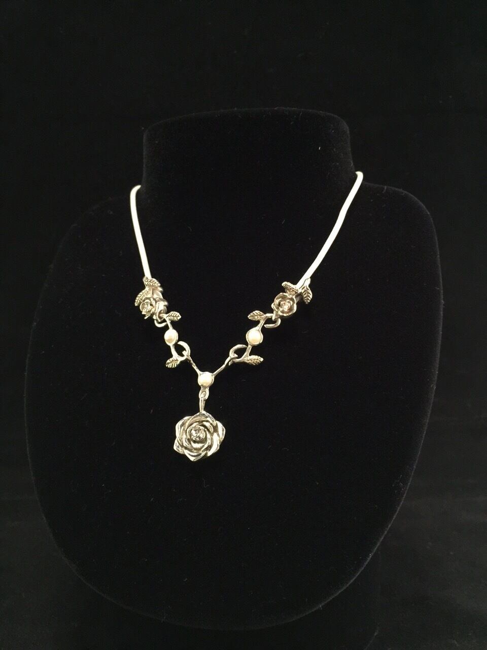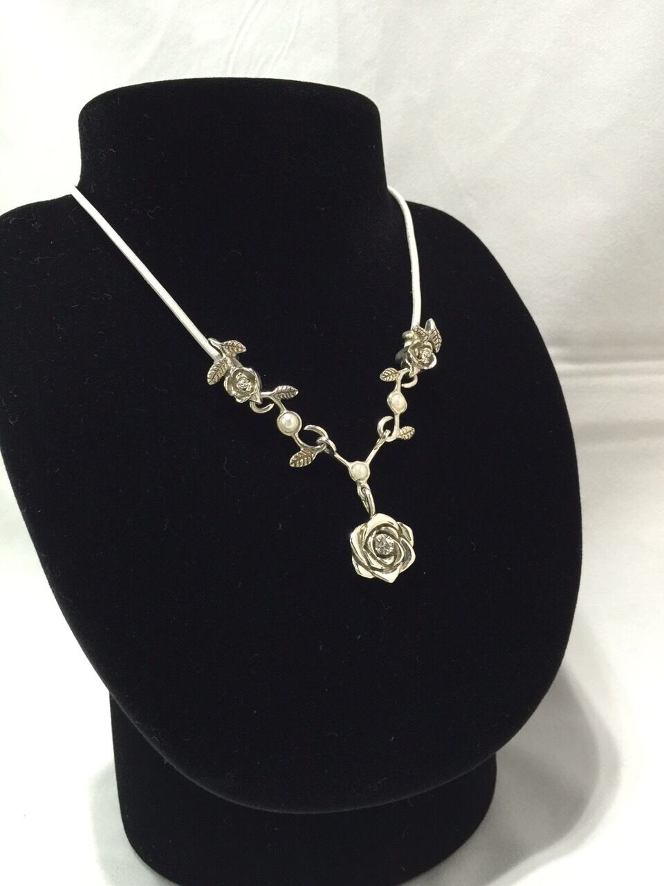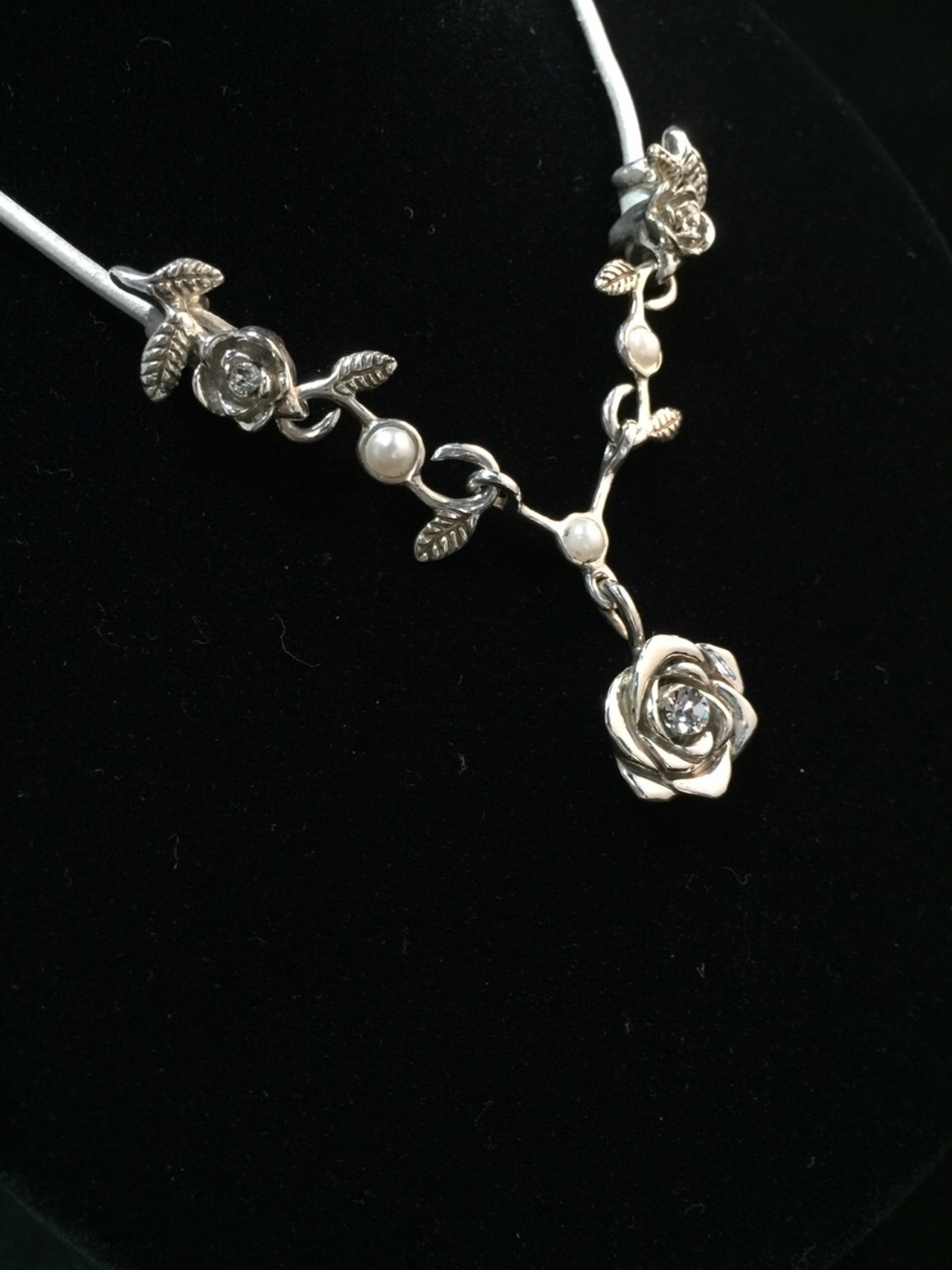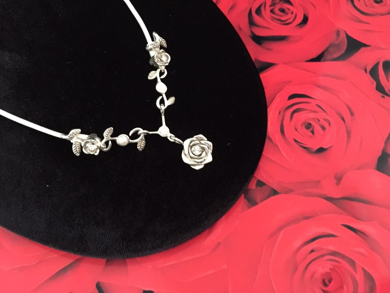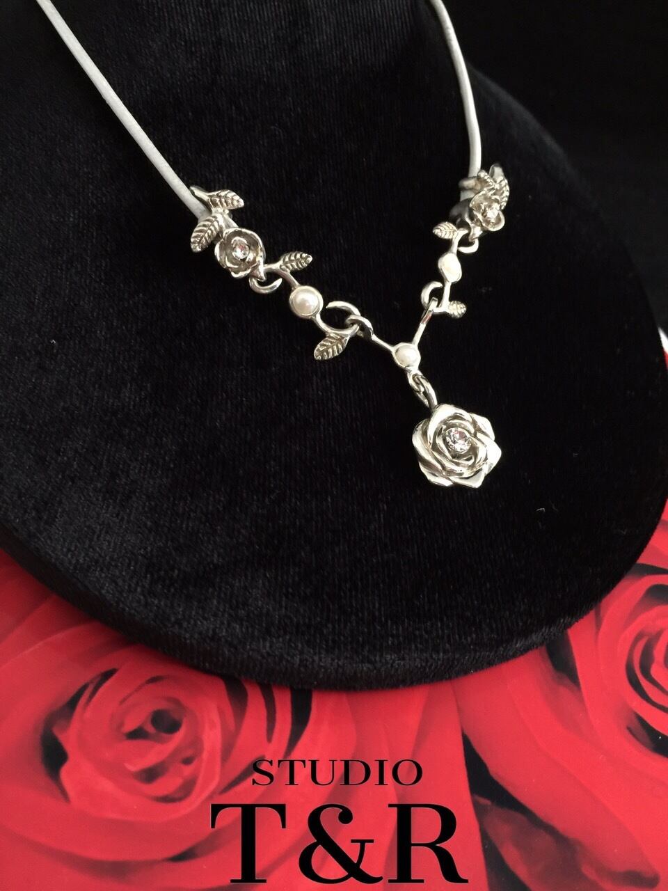 シルバーの6つのパーツを組み合わせた薔薇のフォルムが首元のオシャレを引き立てます。